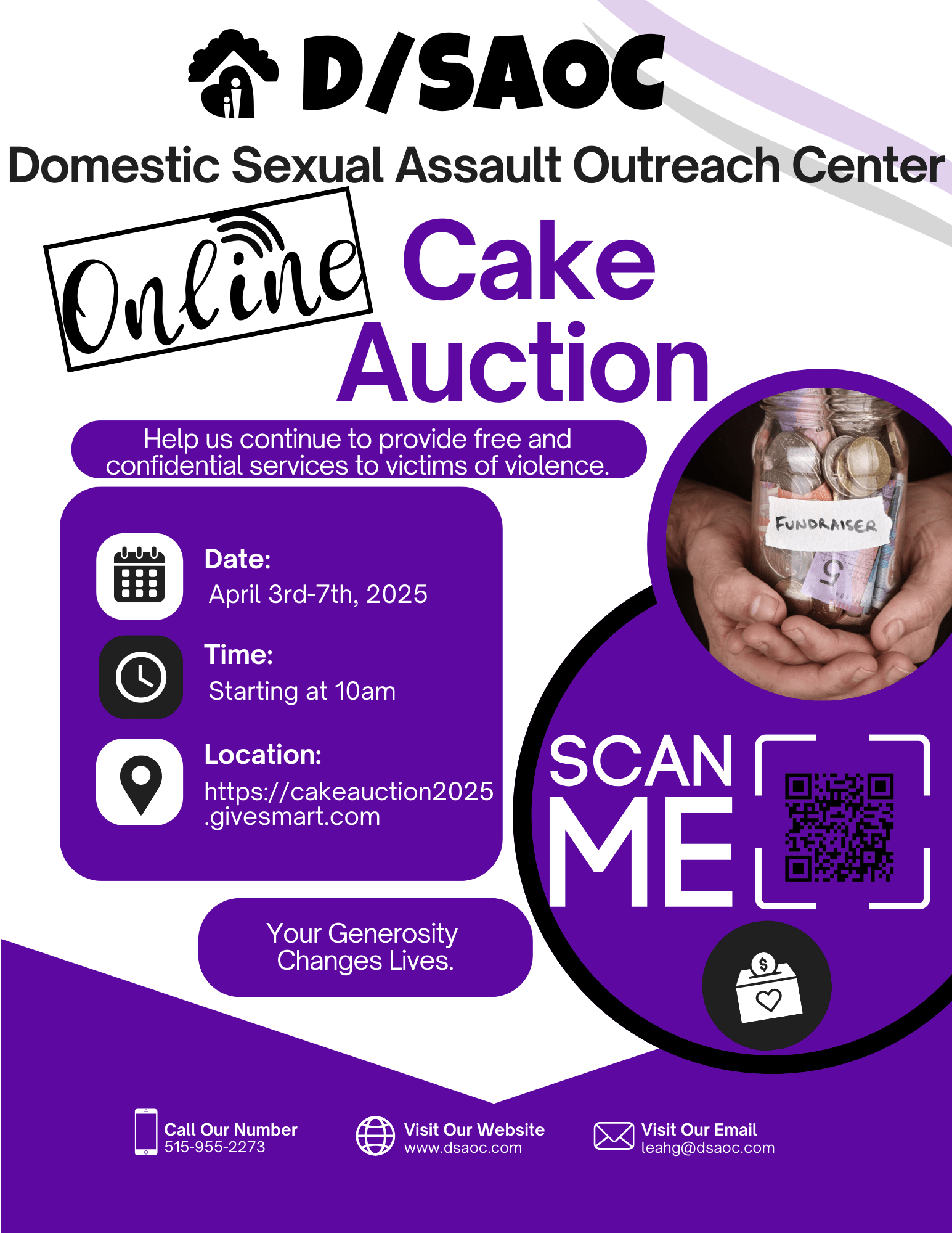 The 28th Annual D/SAOC Online Cake Auction will take place April 3rd-7th, 2025, benefiting the Domestic/Sexual Assault Outreach Center (D/SAOC), which serves 20 Mid-Iowa counties. This annual event is more than just an auction—it’s a lifeline. The funds raised help us provide free and confidential services to survivors of domestic violence, sexual assault, stalking, human trafficking, and other violent crimes, as well as to loved ones of homicide victims. With the challenges of recent years, including the lasting impact of COVID-19 and budget constraints, we are more determined than ever to ensure survivors have access to the critical support they need. But we cannot do this alone.