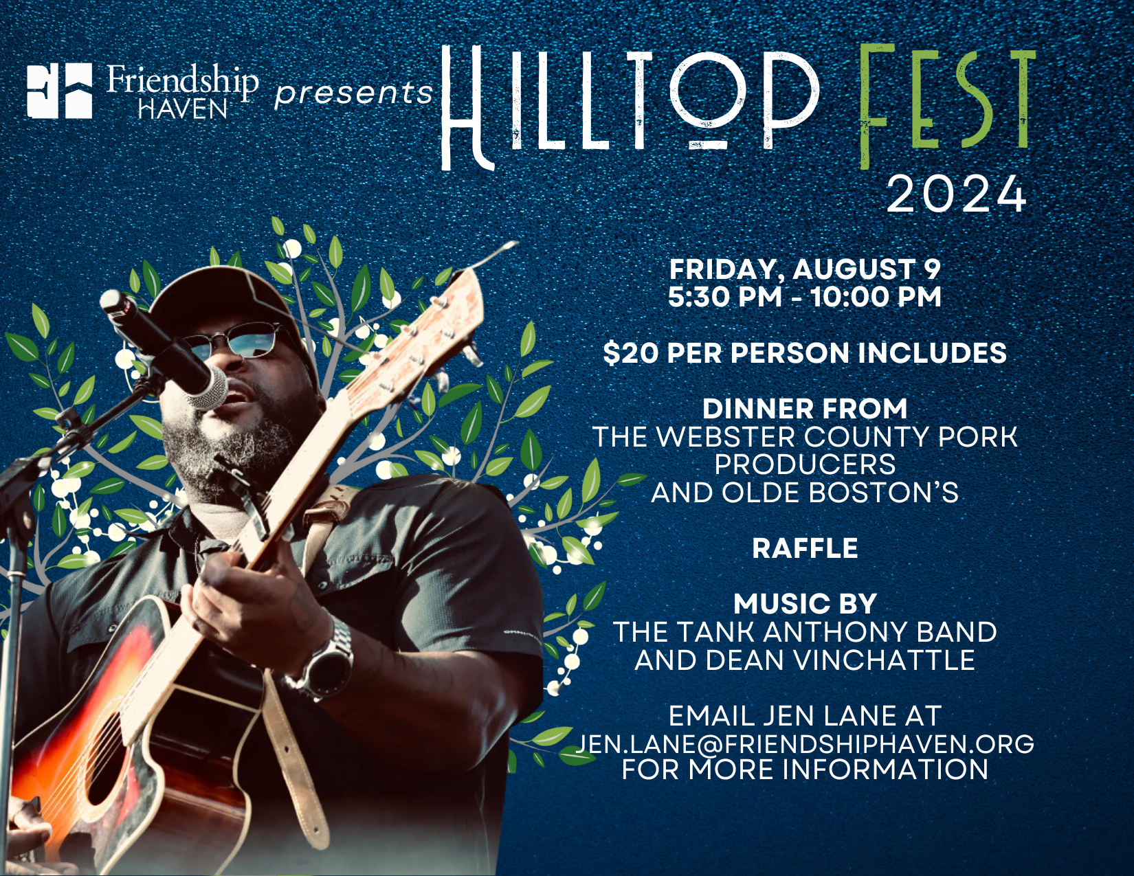 Get ready to elevate your spirits and join the celebration at Hilltop Fest 2024! Held on the picturesque campus of Friendship Haven, our annual fundraiser promises an unforgettable evening filled with music, fine dining, and sheer FUN! We're excited to announce that the Tank Anthony Band will be headlining this year’s event, with DJ Dean Vinchattle playing during the meal. Food will be courtesy of the Webster County Pork Producers and Olde Boston's.